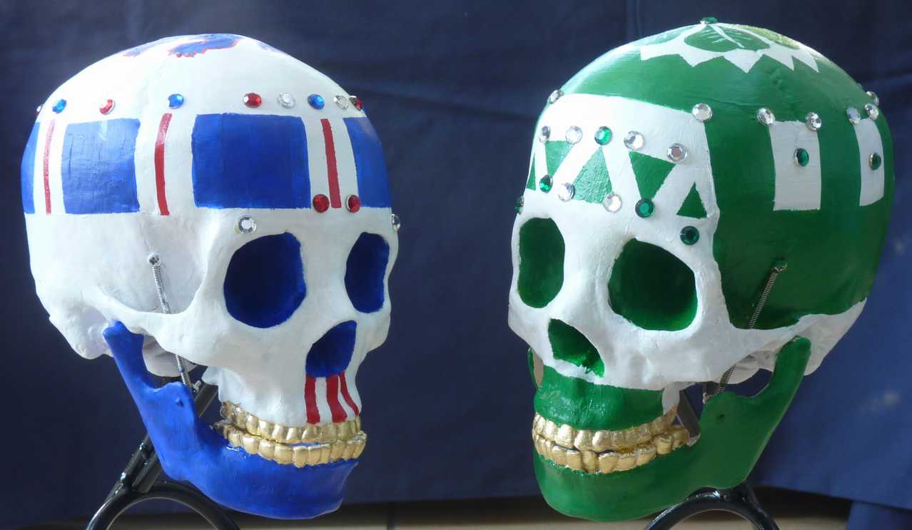 Resins casts of skulls decorated in the colours of Celtic and Rangers football clubs of Glasgow